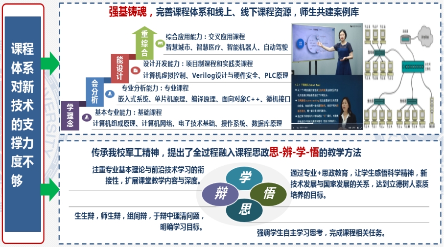 对接智能产业需求梳理完善课程体系夯实专业基础,通过项目制和交叉应用等课程递进式培养设计开发能力,以真实军工项目贯穿实施提升解决复杂工程问题能力。传承我校军工精神,构建启蒙、融合、践行“三级递进”兵工精神铸魂新体系。提出了全过程融入课程思政“思辨学悟”的教学方法强化社会责任感,通过自主学习思考-辨中理清问题-前沿技术学习-感悟科学精神,强化了对新技术的支持。
