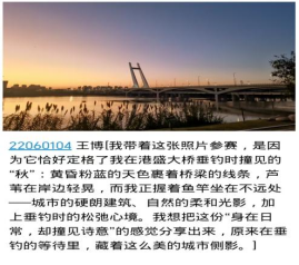 本次活动以“最美秋天”为核心主题,征集范围涵盖校园内外的秋日景致与生活场景。同学们踊跃分享眼中的秋意,投稿作品内容丰富、创意十足:既有校园内铺满银杏的金黄小径、枝叶间洒落的斑驳暖阳、湖畔倒映的层林尽染,也有校外山间的漫山红叶、港盛大桥的黄昏剪影、街头巷尾的秋日烟火,更有垂钓时偶遇的诗意瞬间、夜色里裹挟余温的幽静小径等充满生活气息的画面。每一幅作品都紧扣主题,通过独特的视角与构图,生动展现了秋日的静谧与绚烂,彰显了同学们出色的审美素养与创作才华。部分投稿者还附上了简短的文字说明,分享拍摄地点、创作灵感与秋日感悟,让静态的影像承载了更多情感与故事,为秋景增添了别样温度。