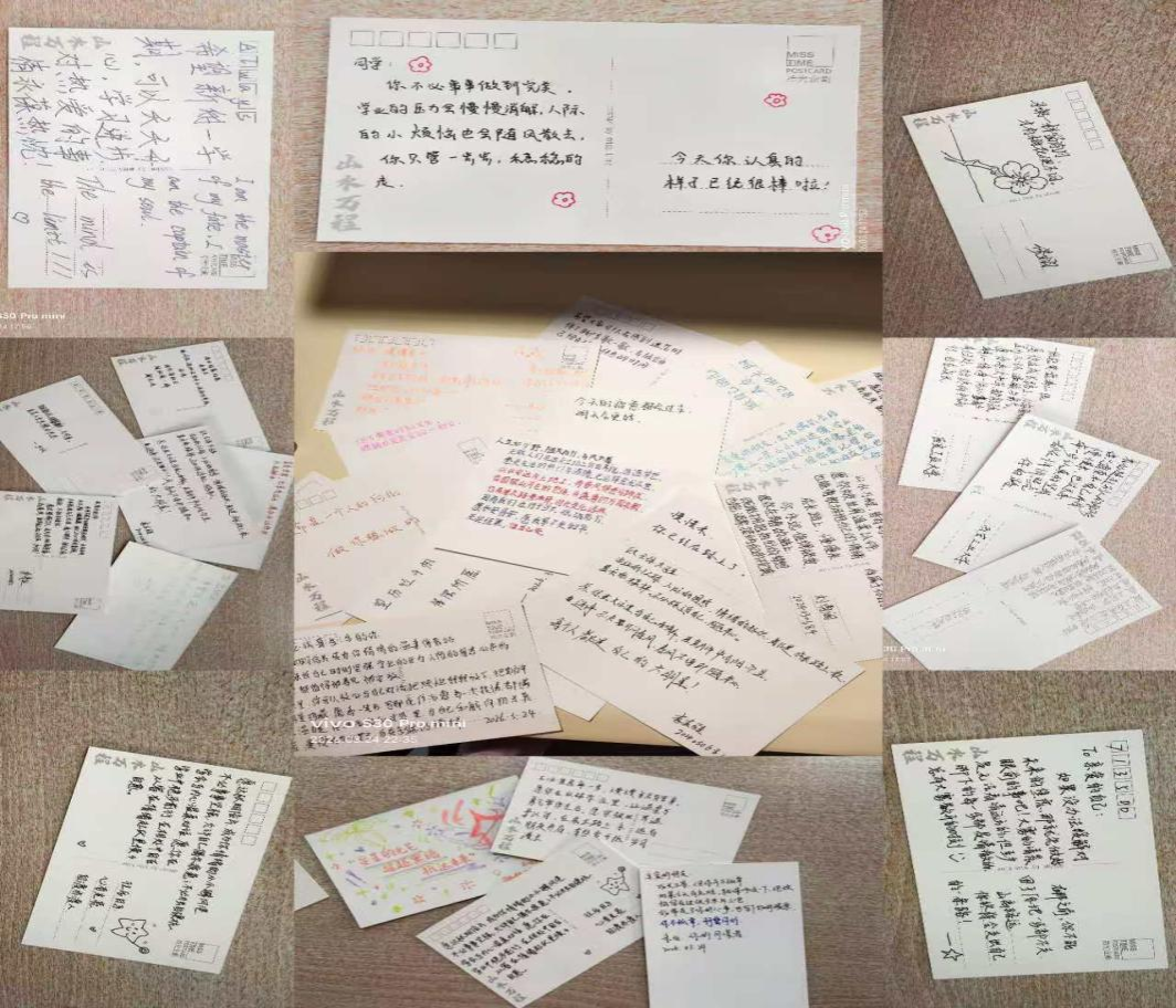 一张张明信片,成为了同学们的“心灵留言册”:有的写下对同窗好友的暖心寄语,愿彼此并肩同行、共克难题;有的记录自我鼓励的话语,接纳不完美的自己,坚定成长的脚步;还有的分享情绪调节的小感悟,以自身经验为同伴送上心理疏导的小妙招。简单的文字里,藏着最真挚的关怀,方寸卡片间,凝聚着朋辈同行的温暖力量。